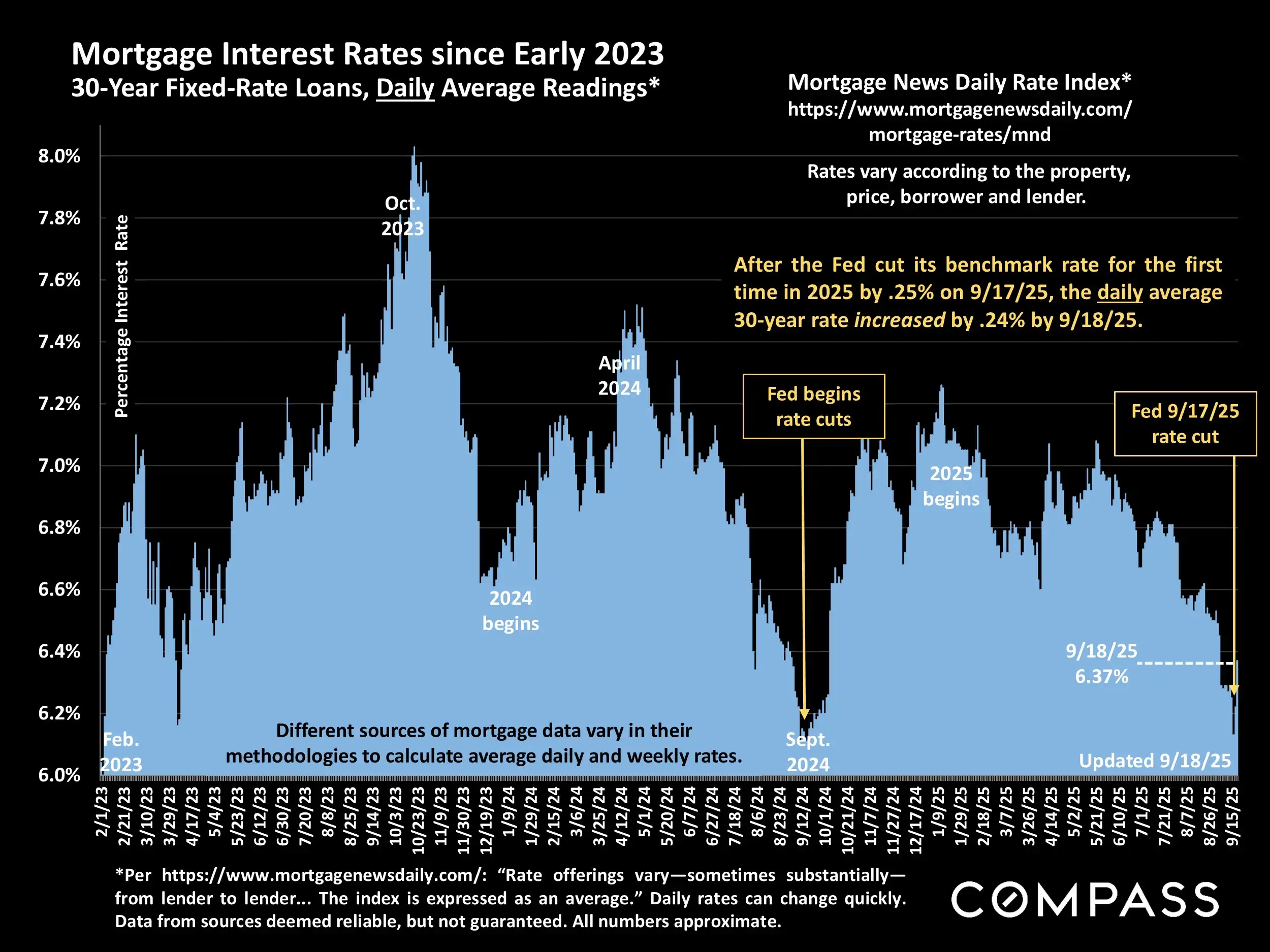 Last year in September 2024, when the Fed first cut its benchmark rate since 2022, mortgage rates also increased (dramatically). See chart below. But it’s far too soon to predict how this will all play out in coming weeks and months.
