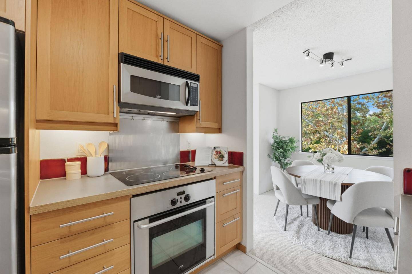 ELEGANT & AIRY PALO ALTO RETREAT | Light-filled and beautifully updated, this 2-bedroom, 2-bath home combines comfort and convenience in a tranquil community setting. The open-concept living and dining area features abundant natural light and a private balcony overlooking mature trees. The modern kitchen offers stainless steel appliances and maple cabinetry. Spacious bedrooms and updated bathrooms enhance daily living. Enjoy in-unit laundry, covered parking, and access to the community pool and walking paths. Ideally located near Stanford University, Midtown shopping, San Antonio Shopping Center, Mitchell Park Community Center, Caltrain, and major tech employers including Google, Meta, and Tesla. Award-winning Palo Alto schools such as Gunn High School.